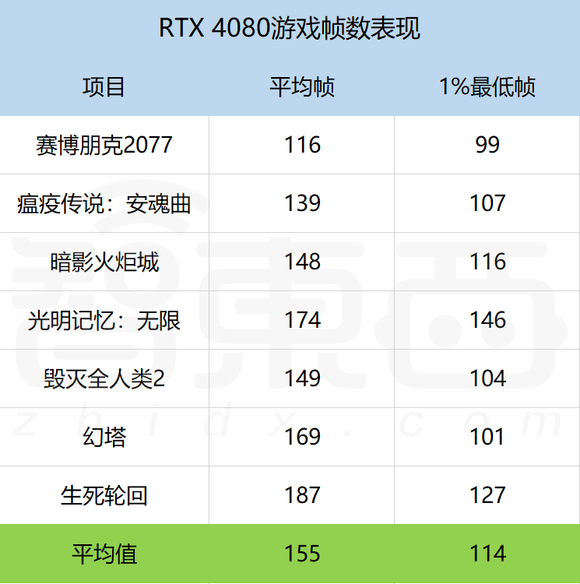 综合来看,英伟达RTX 4080的确兑现了“最高画质畅玩4K游戏”的承诺,几款游戏的平均帧都来到了155左右,可以完全“跑满”4K 144Hz高端电竞显示器,即使是最低帧也来到了平均114帧左右。