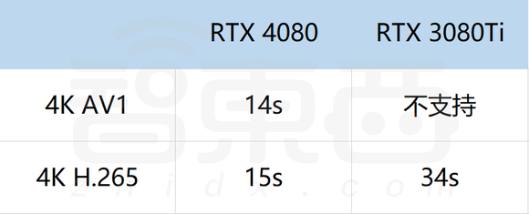 我也重点测试了AV1和H.265两种编解码的视频导出渲染。在实际测试中,同样导出一段大小12GB、时长2分钟的4K 30帧视频,在H.265格式下,RTX 4080的用时为15分钟,而RTX 3080Ti用时则为34分钟,提升幅度达到一倍以上。