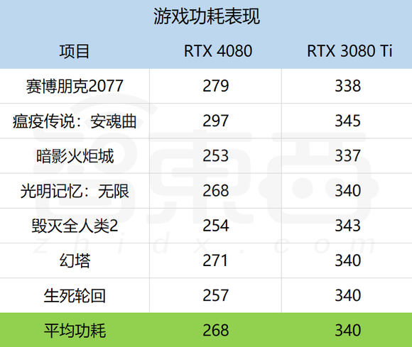 也就是说,在性能提升一半以上的同时,RTX 4080的功耗还平均下降了四分之一左右,能效比提升十分明显。