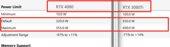 在GPU-Z中我们可以看到,RTX 4080公版的默认功耗为320W,功耗最大值仅为355W,与RTX 3080Ti默认功耗350W基本相同。