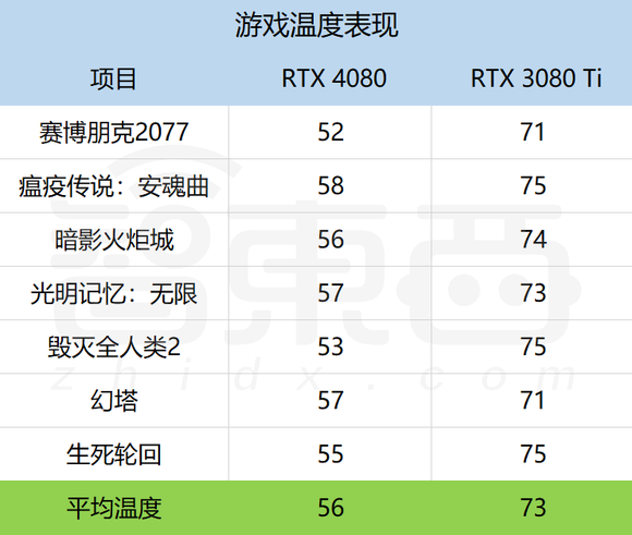 整体看下来,RTX 4080在游戏和生产力场景中的表现都令人惊喜,那么现在问题来了,这样的性能提升,需要有什么牺牲呢?是功耗还是温度?