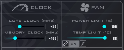 因此我这次只模拟了普通玩家进行入门级简单超频,在Afterburner软件中,我将显卡功耗和温度拉满,将频率拉高了50MHz,显存频率拉高了100MHz。