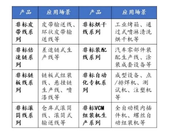 非标自动化设备就是根据用户需求定制的自动化系统集成设备,旨在实现特定生产环节或生产过程的自动化操作。非标自动化设备主要包括两大类:一类是将前后工序串联起来的流水线产品,包括非标皮带线、倍速链、链板线、滚筒线等;另一类是执行具体操作的专用设备,包括烘干机、成型设备、点/排焊机、测试机、注塑机等,以及全自动模内插件机、螺丝自动组装机等。