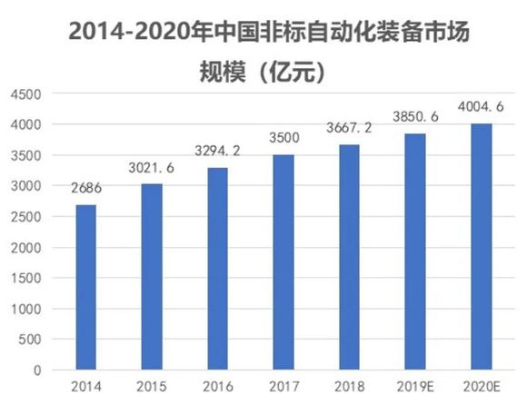 随着劳动力成本的上升和人力资源的匮乏,各个行业积极推进制造业自动化、智能化升级,非标自动化设备的市场呈现稳步增长态势,2018年市场规模为3667.2亿元,预计在2020年市场规模将突破4000亿元。