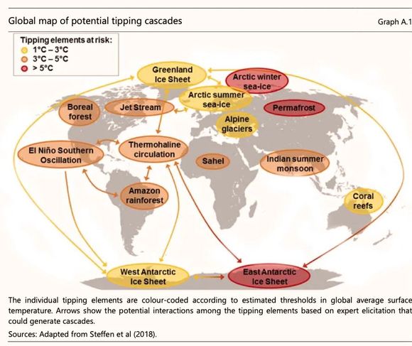 注:北极冰层、亚马逊丛林等全球气候的关键组成部分,以及能承受的最高升温范围,箭头表示各部分之间相互的牵连。
