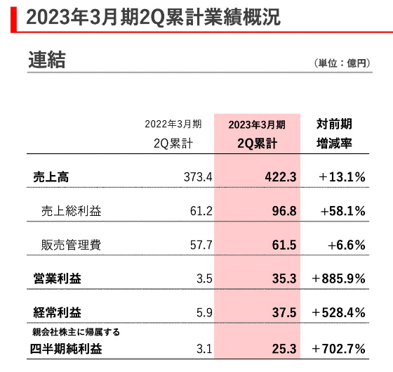 综合看来,该业务板块在2022年二三季度的业绩增长情况为:销售额达到60.46亿日元,环比增长44.8%;营业利润达到16.23亿日元,同比增长112.8%。