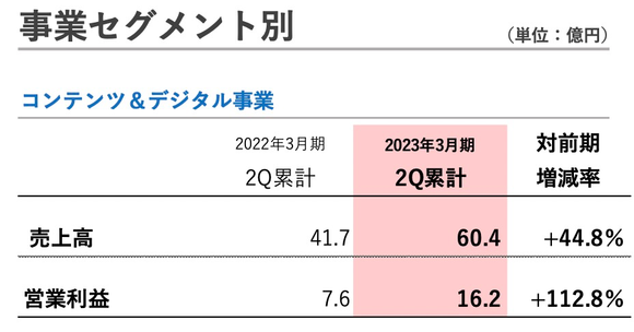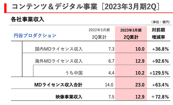 与此同时,Digital Frontier(圆谷旗下、拥有大型CG制作部门的电影制作公司)还在持续推进以国内大型游戏公司为中心的CG影像制作及与Netflix联合推进的VFX(视觉特效)影像制作等,其销售额累计达到22.57亿日元,环比增长25%;营业利润累计达到2.16亿日元,同比增长56.3%。