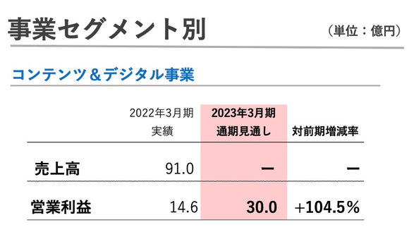 在【内容与数码事业】这一业务板块中,圆谷打算顺着“奥特曼”品牌认知度提高这一趋势紧追而上。圆谷制作公司预计这一业务板块的全年营业利润将达到30亿日元,环比增长104.5%。