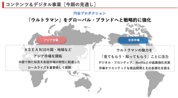 此外,针对北美市场,圆谷指出,要强化充实与Digital Frontier及Netflix在业务上的协作等,以提高“奥特曼”品牌的知名度;要全力致力于让“奥特曼”的魅力为北美市场受众所感、所知,切实提升品牌力,并以面向市场的商品开发和多样化为目标,进一步提高其成长力。