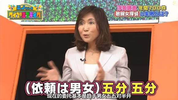 日本女侦探宗万真弓,一年调查超过700件出轨事件。在一次节目中她透露,现在日本家庭的出轨情况,男女各占一半。同时特别强调:妻子们的出轨,格外受到不伦电视剧的影响。