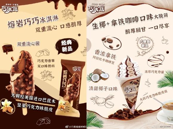 消费者偏好甜品口味,巧乐兹就研发并推出了满足消费者口味需求的巧丝绒冰淇淋;消费者喜欢街饮,巧乐兹就研发了生椰拿铁的口味;消费者对冰淇淋的口感有更高需求,巧乐兹就丰富产品的结构层次,熔岩巧巧就是以外层美国进口巴旦木作为其卖点,与消费者沟通。