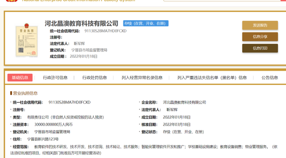 工商信息显示,晶澳教育成立于2022年1月,注册资本3亿元人民币,由晶澳科技全资控股。公司地址位于宁晋县,属于软件和信息技术服务业,经营范围包含:教育软件的技术研发、技术开发、技术咨询、技术转让、技术服务;智能化管理软件开发和推广;学校基础设施建设;教育设备销售;物业管理服务。