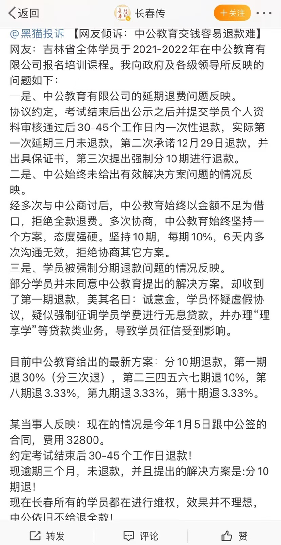 公开资讯显示,中公教育的“包过”协议在之前就引起学员争议。不少学员曾在公开平台投诉:中公教育承诺不过退费,在约定退费时间到期后拖延退费,甚至有学员被要求强制分期退费。