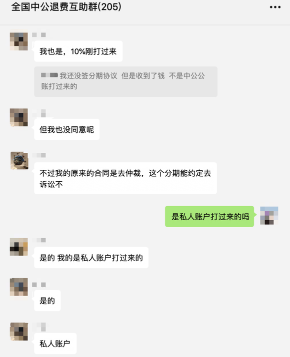 界面新闻记者也通过多个中公教育退费群了解到,许多学员的确收到中公教育分期退费的通知,包括武汉、杭州、太原、安徽、甘肃等地学员。其中,部分学员还收到了来自非中公教育公司帐户而是私人账户转账的分期退费款。