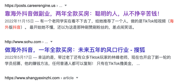 营销娱子酱检索整理发现,知乎等中文互联网社区已经有大量此类教程上线,有人甚至打出了"做海外抖音,一年全款买房"的口号,但Wilson自己的公众号文章中,却对这类暴论嗤之以鼻,并表示:"以我每天从6点干到12点的经历告诉你,就算我这么努力也不会有这么高收益的,如果有,那我认输。"