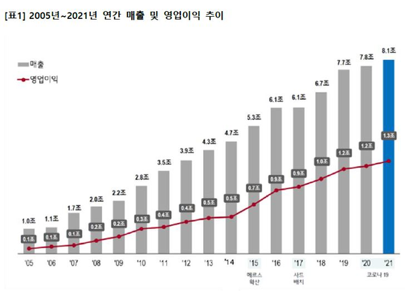 LG生活健康2005年-2021年业绩增长