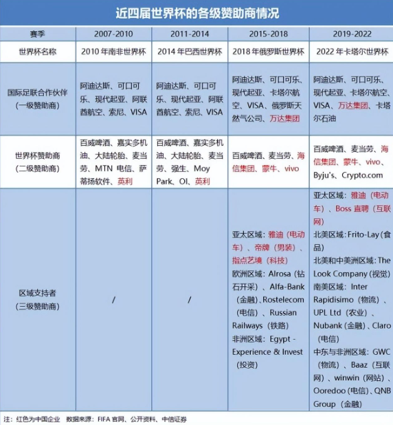 作为2010南非世界杯、2014巴西世界杯二级赞助商的英利,由于高额的赞助费加重了公司的运营负担,即便因世界杯带来了光环和名气,也难以填被财务窟窿,2015年债务重组,2018年退市前市值蒸发超200亿元,2020年司法重整,英利集团从世界杯观众视野彻底消失。