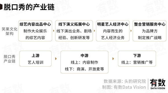在这条产业链中,笑果上游挖掘培养人才,中游线下开放麦和商演,线上内容制作,下游是营销推广。