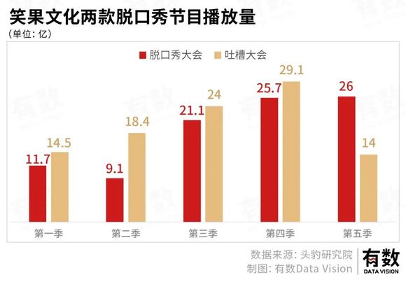 这一年吐槽大会第一季开播,总播放量超过14.5亿,同年,脱口秀大会相继突破11亿的播放量。两档节目加起来,终于能赶上《中国好声音第四季》的播放量。