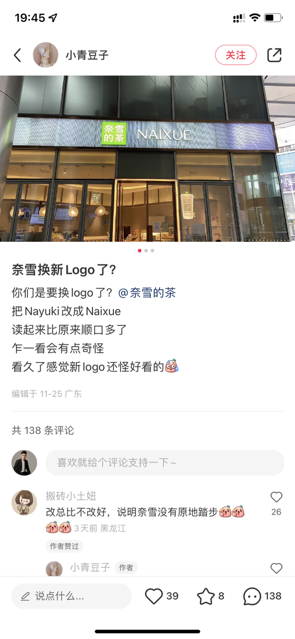 从广西南宁一个网友所发的小红书中可以看到,在当地一家门店门头上,以往奈雪的茶logo里标志性的日文平假名“の”换成了汉字“的”,英文的“NAYUKI”也变成了中文拼音“NAIXUE”,网友们猛一看甚至怀疑是遇到了山寨店。