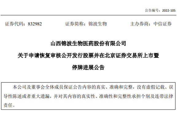 11月23日,山西锦波生物医药股份有限公司发布公告称,公司申请恢复审核公开发行股票并在北京证券交易所上市。