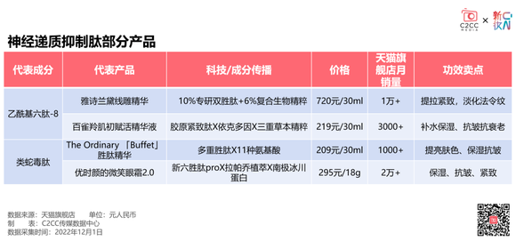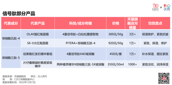 OLAY的大单品——超红瓶面霜,就主打信号肽抗老,其天猫旗舰店宣称“30年专研信号肽”,具有5大专利,在信号肽的研究上建立了相关壁垒。且通过实验室证明,其信号肽组合能更强激活胶原信号,同时也经过百人测试,验证28天提升皮肤紧致度,具有抗老功效。截至12月1日,该单品在天猫旗舰店月销3万+。