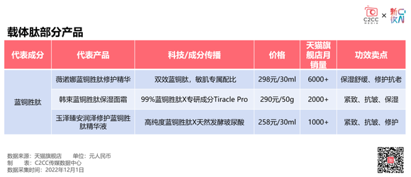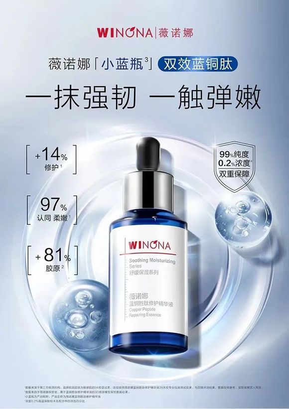 代表产品:薇诺娜蓝铜胜肽修护精华、韩束蓝铜肽紧致面霜、玉泽臻安润泽修护蓝铜胜肽精华液
