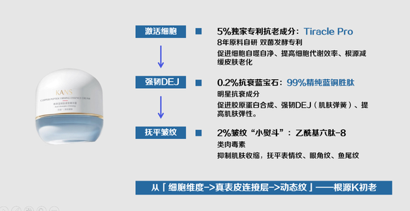 蓝铜胜肽是多肽的一种,将铜离子这样的金属微量元素运送到目的地,从而刺激胶原蛋白生成,帮助皮肤更好的愈合伤口,增加弹性。是皮肤科学领域公认的最不刺激的抗老成分之一,美国FDA批准用于临床伤口治疗。