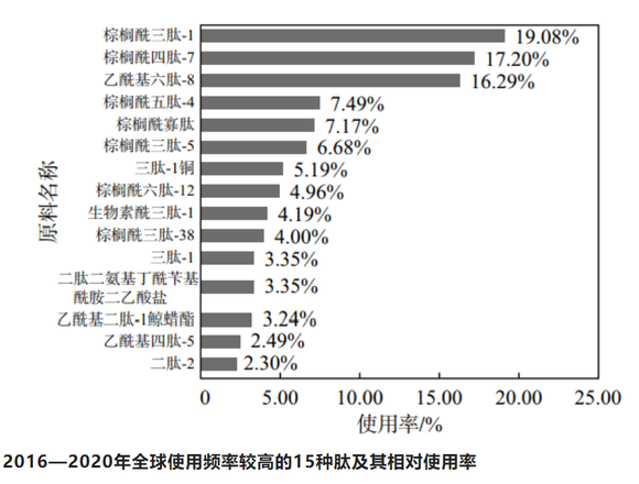据不完全统计,全球2016—2020年含“肽”成分的个人护理用品产品约有16758个,涵盖的主要品类包括面部/颈部护理(60.89%)以及眼部护理(19.34%),其他品类如面部清洁、身体护理等产品数量较少。对应用肽原料的个人护理用品进一步分析,排在使用频率较高的前15种肽如下图,这些肽原料中除了乙酰基二肽-1鲸蜡酯可以起到舒缓修护功效,其他肽在产品中主要发挥改善皱纹抗衰老的护肤效果。