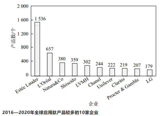 此外,全球肽原料应用较多的前10家企业如下图所示,其中仅雅诗兰黛一家含肽原料的产品数就达1536个,占2016—2020年含肽原料总产品数的9.16%,接下来依次为欧莱雅、Natura &Co、资生堂、路易·威登、香奈儿、联合利华、娇韵诗、宝洁、LG。