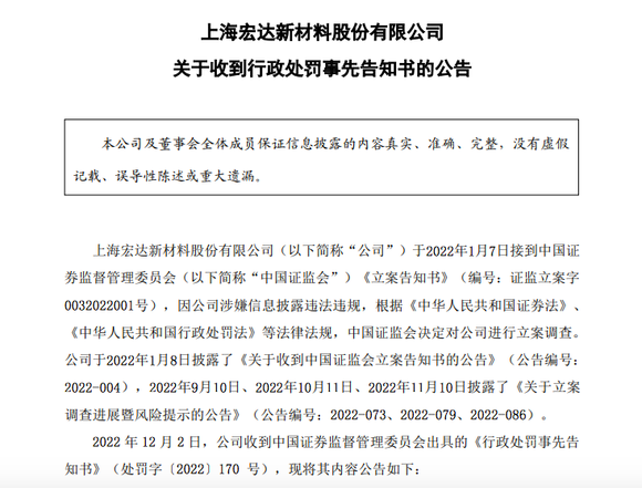 12月4日,ST宏达公告称,公司收到中国证监会出具的《行政处罚事先告知书》,涉嫌违法的事实如下:未按照规定披露实际控制人;2019年至2020年年度报告虚增收入、利润;2020年年报未计提商誉减值,虚增利润。