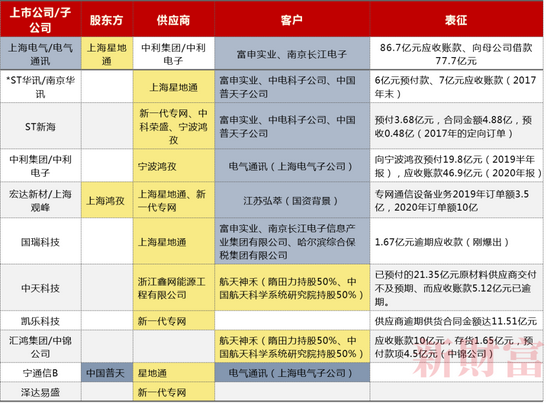 据《证券时报》此前报道,自2014年起,至少有13家上市公司,包括:ST新海、*ST华讯(现:华讯退)、凯乐科技(现:*ST凯乐)、中利集团(现:ST中利)、亨通光电、宁通信B、飞利信、瑞斯康达、宏达新材(现:ST宏达)、中天科技、国瑞科技、上海电气、汇鸿集团。