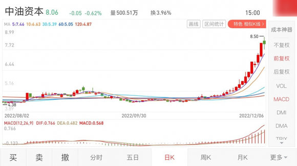 华夏能源网(公众号hxny3060)注意到,从11月10日起,中油资本掀起了接连上涨的狂潮,连续18个交易日上涨收盘,12月5日当天更是封住涨停,累计涨幅高达172%。虽然在6日收跌,但仍创出8.5元的新高,19个交易日股价接近翻倍。