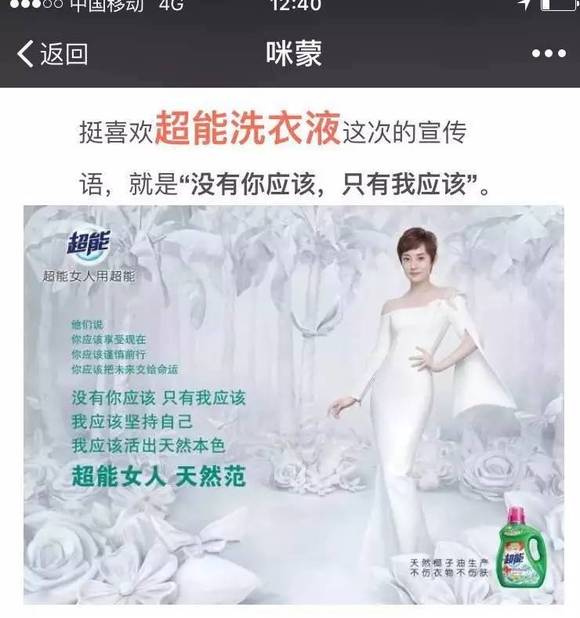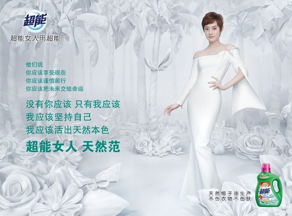 最近超能洗衣液推出新的TVC广告,其主打“没有你应该,只有我应该”的口号,极具感染力,其中以孙俪领衔,植物学家、歌手、创业者的四个不同角色的女性,把这句话演绎成了自己人生的追求,很励志,也很有激情,其中的“超能”一词也赋予了不同的意义,“天然范”一语双关了产品的天然工艺,同时也在表达女性的天然魅力。