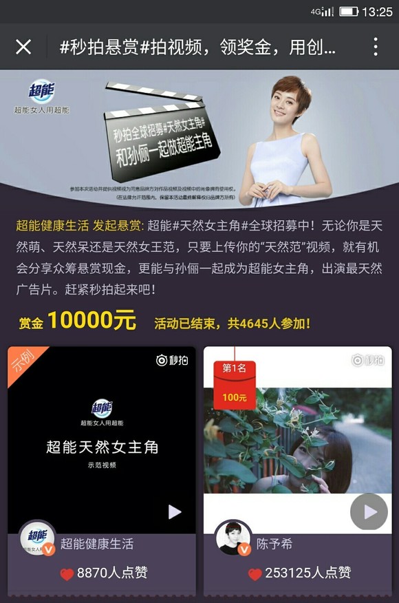 从话题引爆时4条TVC广告,到线下线上网红直播,关于“没有你应该,只有我应该”话题已经让受众了知,也从4个(孙俪+3个素人)到百个(网红)的参与变化,8月22日超能在秒拍发起针对全民参与的话题,征集“超能天然女主角”,重点演绎“天然范”!只要上传“天然范”视频,就有机会分享众筹悬赏现金,更有机会与孙俪一起拍广告片。