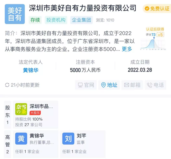 其中,令人印象深刻的是2022年3月28日,深圳市美好自有力量投资有限公司成立,法定代表人为黄锦华。天眼查信息显示,美好自有力量投资公司由奈雪的主体“深圳市品道餐饮管理有限公司”100%持有,后者的最终受益人为彭心。
