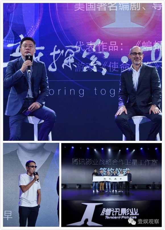 上:右一为《蝙蝠侠三部曲》编剧David S. Goyer;左下为钮承泽;右下为腾讯影业战略合作卫星工作室签约电影人