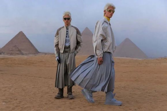 近日,Dior 2023早秋男装系列于埃及开罗的吉萨金字塔旁正式发布。在繁星与金字塔的恢弘映衬下,Dior男装艺术总监Kim Jones以75套造型向品牌创立75周年致敬。