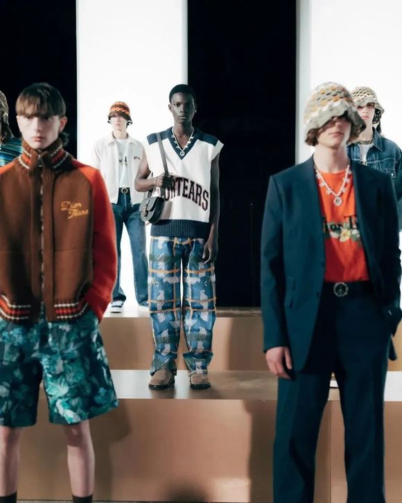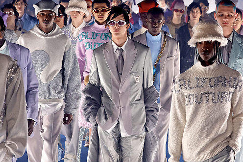 该系列在加州发布,调色、版型着极为浓烈的 ERL青年化的西海岸风格,ERL经典波浪帽衫,在Dior Men中以亮片等拼接方式呈现,兼具街头青年和奢华表现,浅紫、薄荷绿等色调,让本季Dior Men更贴近加州青年的悠闲状态,也是Dior将街头文化引入奢侈品领域的表现。