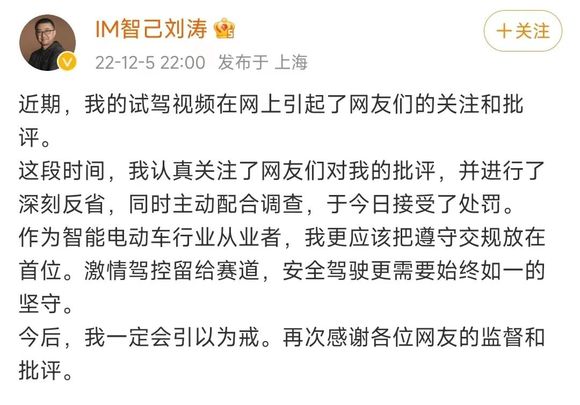 面对行业内外的指责,刘涛很快在其个人微博中也发出了一则道歉声明,他表示“这段时间,我认真关注了网友们对我的批评,并进行了深刻反省,同时主动配合调查,于今日接受了处罚。作为智能电动车行业从业者,我更应该把遵守交规放在首位……”