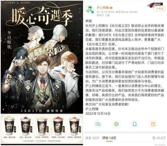 12月14日12点,光与夜之恋发布联名宣传,15点06分,迅速反应过来的光与夜之恋发布了终止与沪上阿姨合作的声明,表示“今日出现辱骂玩家和男主的行为,直接触及了项目组的底线。这些行为不仅违背了基本的合作条款,更是直接伤害了玩家的利益与感情”“光与夜之恋始终谨记将玩家体验放在第一位,因此我们遗憾地宣布,即日起将与沪上阿姨停止合作”。