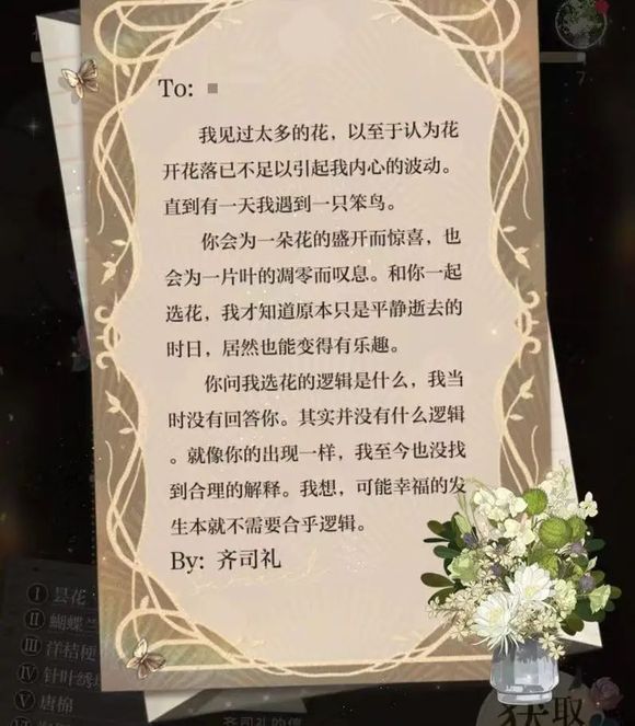 “未婚妻,你的美丽无可比拟,而我将永远予你,尊重与自由的羽翼。”