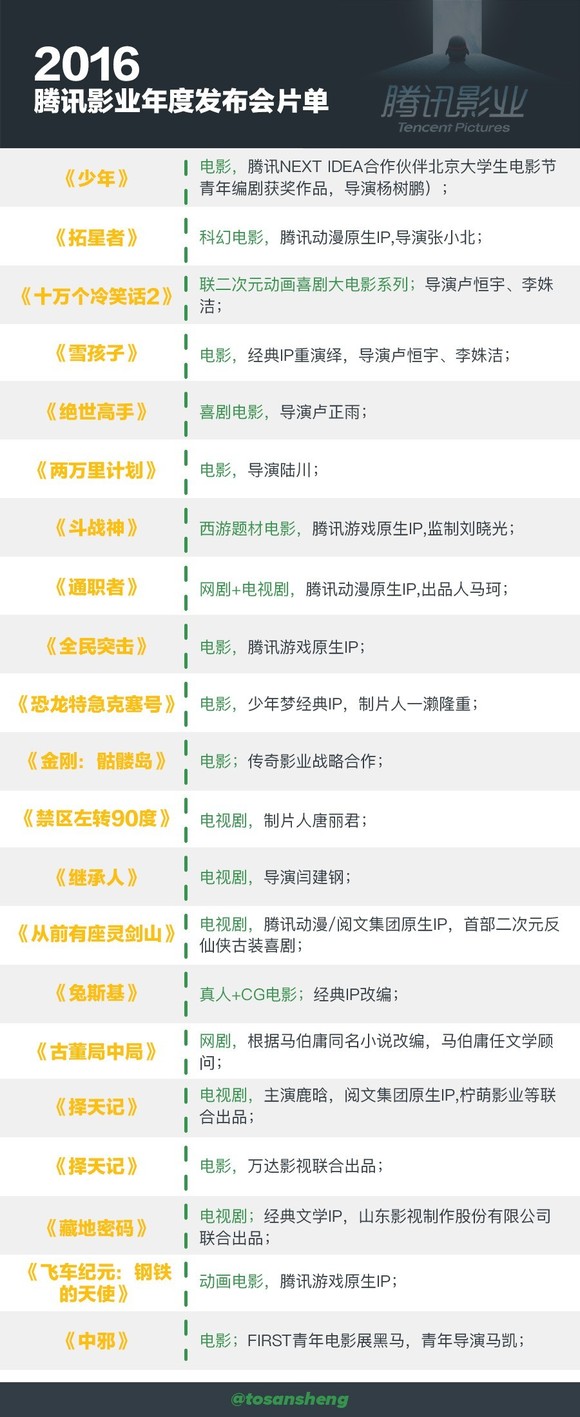 《藏地密码》请到了制作过《琅琊榜》等诸多佳作的山影集团联合出品,《择天记》大电影请到了万达文化集团副总裁曾茂军共同发布;《斗战神》请到了西游系列电影制片人刘晓光担任监制;《雪孩子》联合了上海美影厂和微影时代;《禁区左转90度》则请到了《花千骨》的制片人。陆川导演与腾讯联手《两万里计划》,希望在推进电影的同时,可以同时推动游戏、动漫、文学的综合开发,他认为腾讯是最合适不过的合作平台。