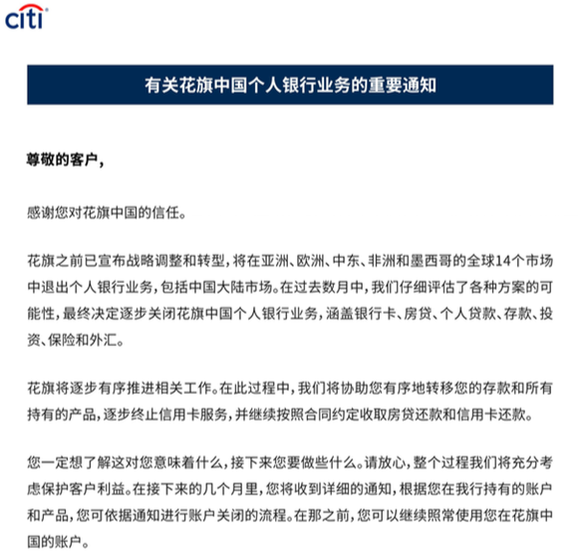 公告称,该行之前已宣布战略调整和转型,将在亚洲、欧洲、中东、非洲和墨西哥的全球14个市场中退出个人银行业务,包括中国大陆市场。在过去数月中,该行仔细评估了各种方案的可能性,最终决定逐步关闭花旗中国个人银行业务,涵盖银行卡、房贷、个人贷款、存款、投资、保险和外汇。花旗将逐步有序推进相关工作。