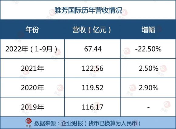 从雅芳国际历年营收情况来看,自归入Natura &Co以来,其营收增幅不大,2020-2021年仅收获个位数增幅,今年前三季度甚至出现了22.5%的大幅下滑。