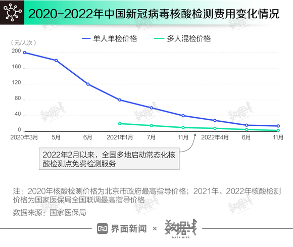 近三年,我国新冠病毒核酸检测费用不断下调,单人检测费用从200元降至14元,降幅超9成。多人混检价格也从每人20元降到2.6元。
