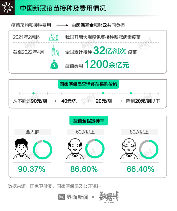 自2021年2月起,我国启动新冠疫苗全民免费接种。截至2022年12月23日,我国31省和兵团累计接种34.7亿剂次,全人群疫苗全程接种率超90%。据国家医保局,截至2022年4月,我国已累计接种32亿剂次疫苗,疫苗费用1200余亿元。
