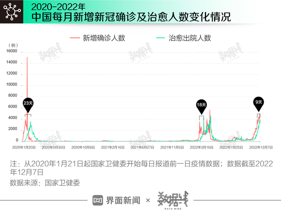 界面数据从国家卫健委每日疫情数据中发现,全国每日新增治愈出院病例增长滞后于确诊病例,但二者的时间间隔越来越小,近三年从平均23天降到平均9天左右。这意味着,新冠患者从确诊入院到治愈出院的时间在逐渐缩短。
