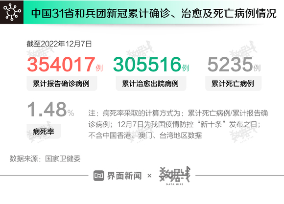 新冠疫情发生三年以来,截至2022年12月7日,国内累计新冠确诊病例达35.4万例,累计死亡病例5235例,病死率(死亡/确诊人数)为1.48%。