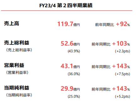 根据ANYCOLOR最新发布的2022年二、三季度累计财报,其销售额119.7亿日元,同比大幅增长92%;营业利润43.1亿日元,同比大幅增长143%;当期纯利润29.9亿日元,同比大幅增长143%。